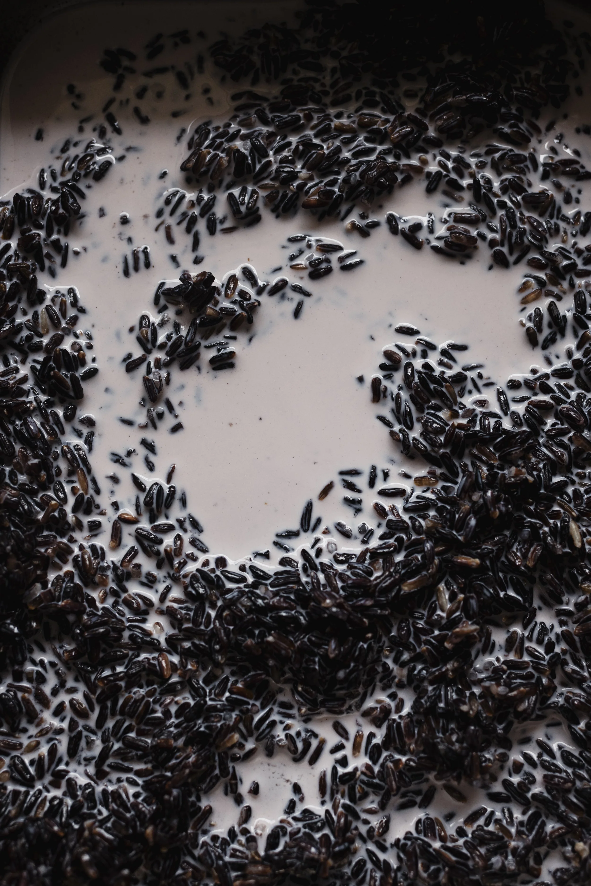 Pre-heat the oven to 180°C (350°F). Evenly scatter the black rice over a lined baking sheet. Toast in the oven for 10 to 15 minutes, agitating every 5 minutes or so, until fragrant. Remove, and immediately tip the warmed grains into a deep dish. Pour in the milk and stir to combine. Cover, then transfer to the refrigerator to slowly steep and release for at least 6 hours or overnight.