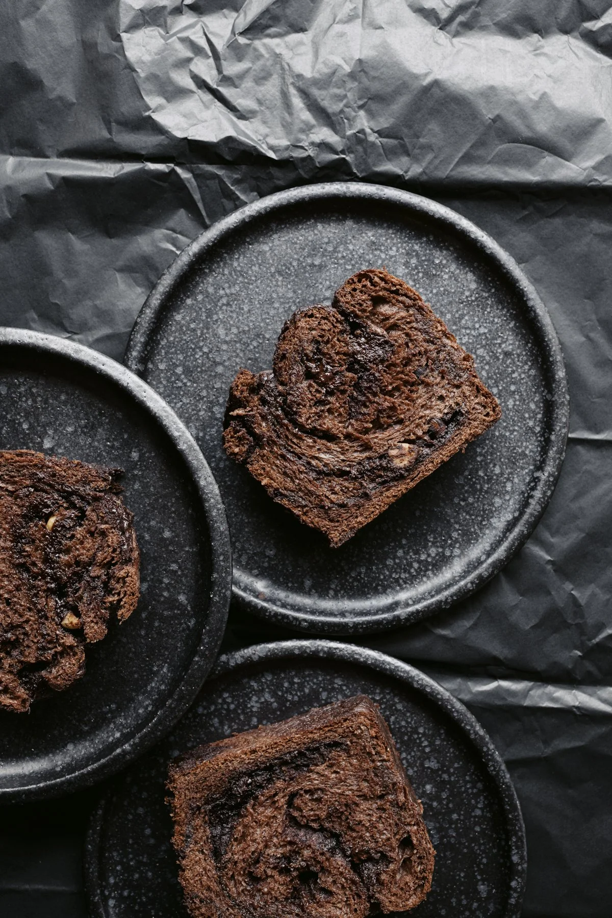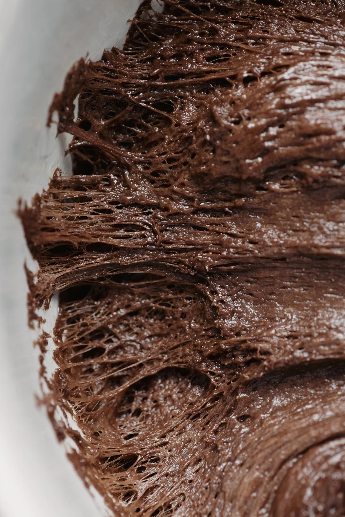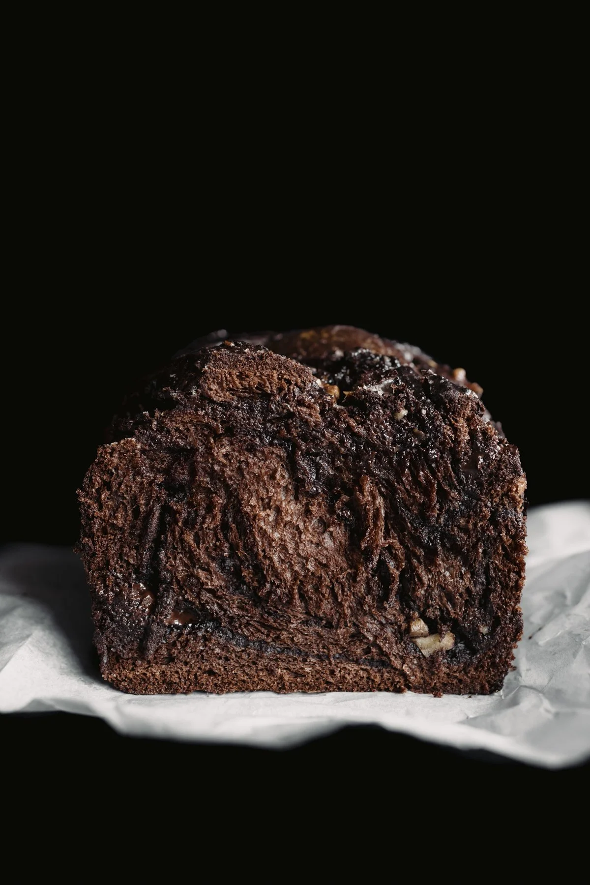 To make the dough, put the flour, cocoa, sugar, yeast, and salt into the bowl of a stand mixer that’s fitted with the dough hook attachment. Mix on low speed to combine, then add in the eggs and milk. Knead on medium speed for a few minutes until rough and shaggy, then raise the speed slightly. Continue to knead for a few more minutes until the dough has begun to catch and then pull away from the sides of the bowl. Add the butter, a tablespoon at a time, waiting until blended before adding in the next. Knead until silky and elastic, about 6 to 8 more minutes. Remove the bowl from the mixer. With some rotor-like pulls and stretches from the base of the dough with your hand, bring it together into a taut ball. Transfer to a lightly-greased large bowl, then cover, and leave to rise in a warm place until doubled in size, 1 ½ to 2 hours.