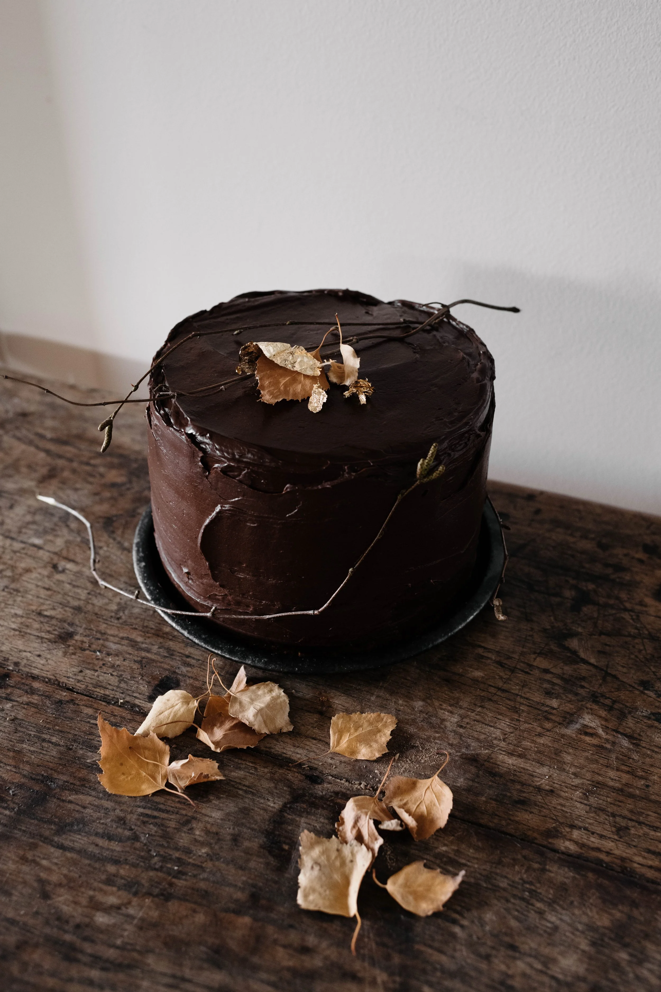 To assemble, set a bottom layer onto a serving plate. Spread over half of the buttercream, smoothing it out to the edges with an offset palette knife. Add on the second layer, cut-side facing down. Pipe the buttercream around the edges to dam, then fill it with enough ganache. Press on the third layer, and spread with the remaining buttercream. Top, with the last layer. Neaten the sides of the cake, and smooth out then fill any noticeable gaps. You want it to be as flush as possible. Scrape over the rest of the ganache, and slick it all over the cake, to coat.