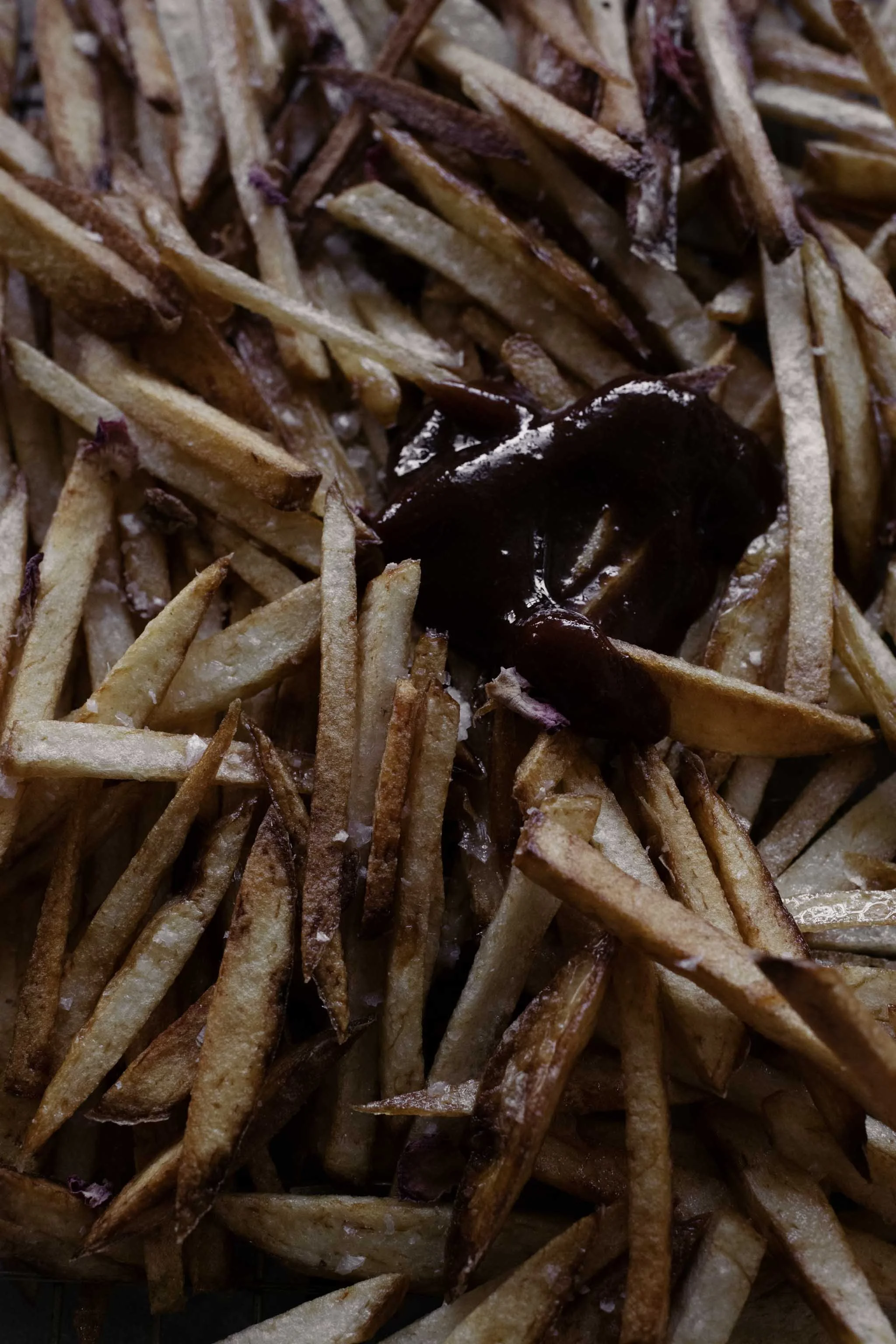 I think I got the idea for the ketchup from an old Gourmet Traveller issue that I went on to manipulate then taint with spices and smoke - the good things. You’d do well to make a double batch of it, storing it in the refrigerator for later slathering when fries aren’t an option. Sometimes, I don’t even make them myself and order them in instead, just for the sauce and wine alone.