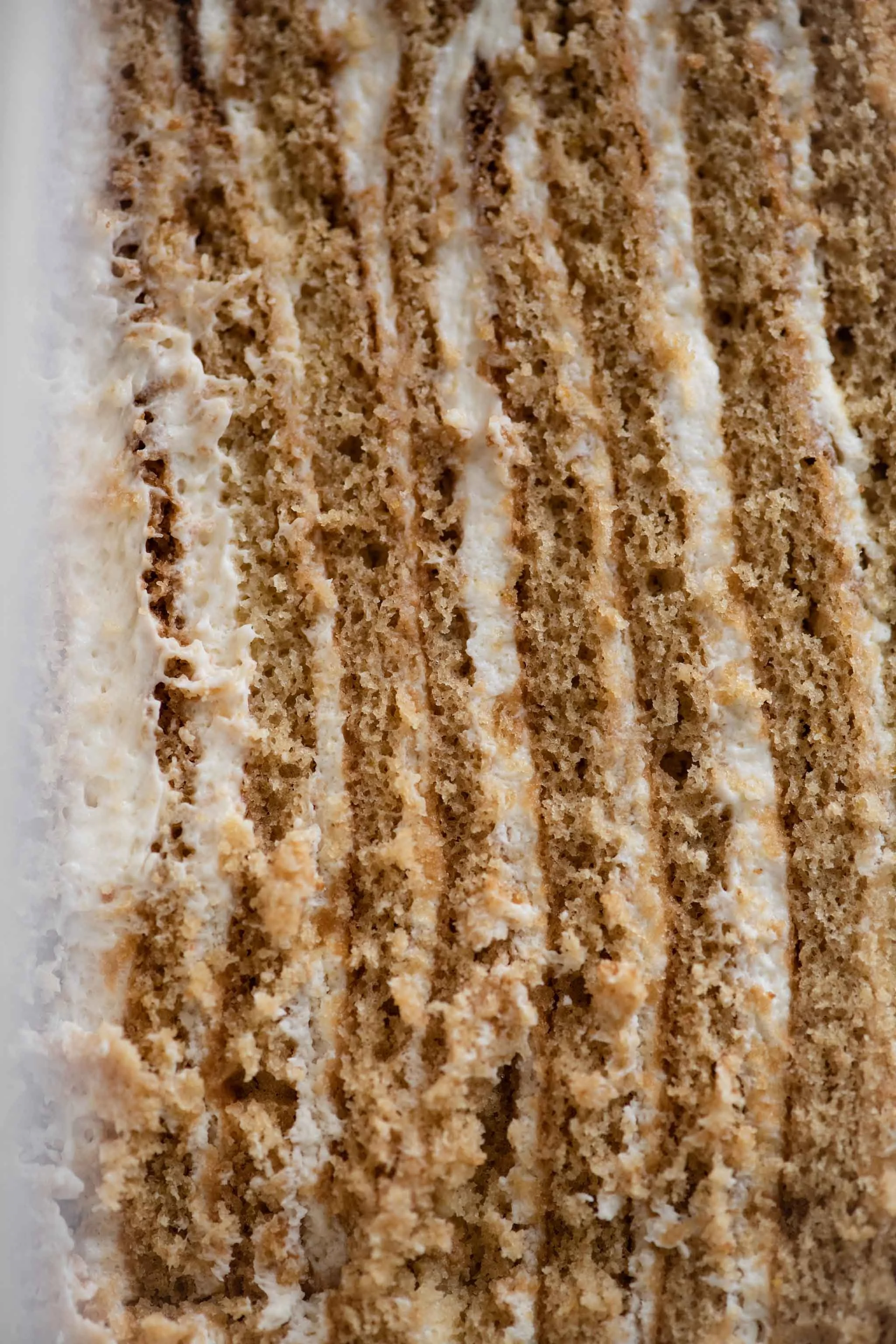 Set a first cake layer onto a board or plate. Spoon a few tablespoons of caramelised cream over the top and all the way to the edges. It’s fine if it spills over a little. Rest a second layer on top, pressing it down with a light amount of pressure, then again, spoon over a scant amount of cream. Repeat until the cake is ten layers high. Slick the top and sides with the remaining cream, then press on the reserved crumb and coat well. It will be messy, there’s no way of avoiding it, but that’s all part of the fun.